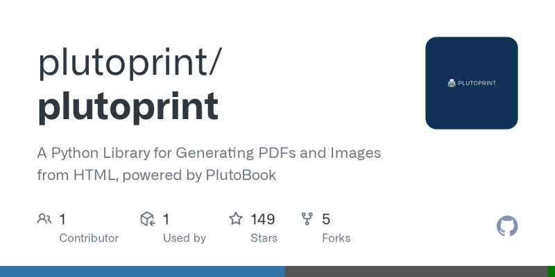PlutoPrint is a Python library that converts HTML and XML content into high-quality PDFs and images using PlutoBook's rendering engine. It offers a simple API for generating documents like reports and invoices, supports command-line usage, and includes advanced features like custom resource fetching for integrating charts from