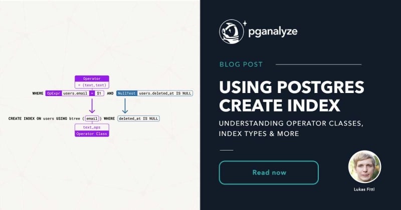 How do you create an index in Postgres?Finding the right index typeSpecifying operator classes during CREATE INDEXSpecifying multiple columns when adding a Postgres indexUsing functions and expressions in an index definitionSpecifying a WHERE clause to create partial PostgreSQL indexesUsing INCLUDE to create a covering index for Index-Only ScansAdding and dropping PostgreSQL indexes safely on productionConclusionSort: