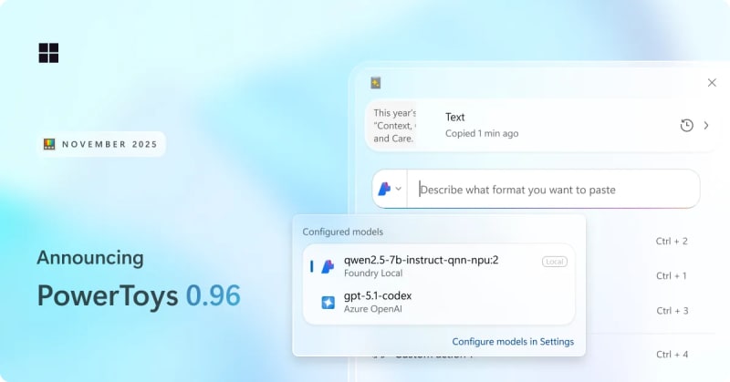 PowerToys 0.96 introduces major upgrades to Advanced Paste with support for multiple AI model endpoints (Azure OpenAI, OpenAI, Gemini, Mistral) and local models (Foundry Local, Ollama). Command Palette receives numerous improvements including search functionality and better extension management. PowerRename now supports EXIF