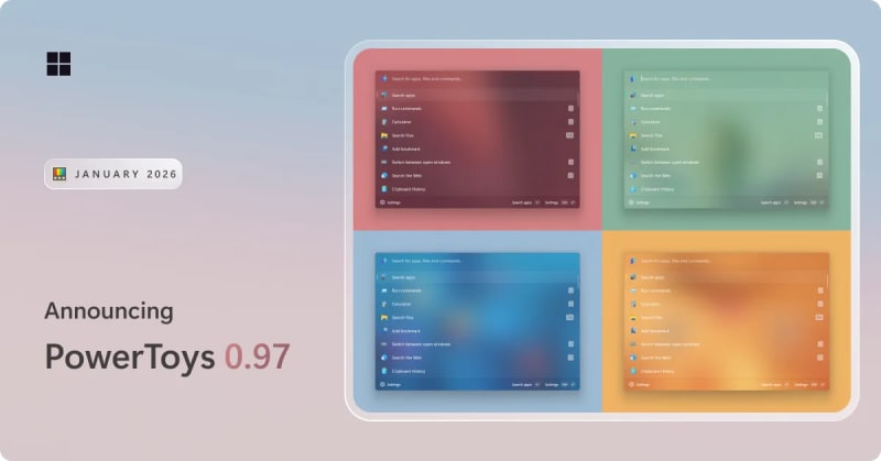 PowerToys 0.97 introduces major Command Palette improvements including UI customization with background images and color tinting, fallback ranking for search results, and a built-in extension to control PowerToys features directly. A new CursorWrap utility enables cursor wrapping across monitor edges for multi-monitor setups.
