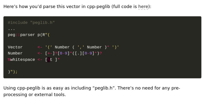 This post discusses the practical use of Parsing Expression Grammars (PEGs) and introduces cpp-peglib, a single-include C++ library that simplifies parsing. It provides examples of parsing a vector format and a string format, and demonstrates how to extract data from the parser. It also includes links to PEG libraries for Go, Python, and Rust.