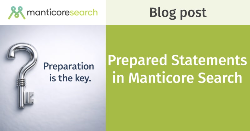 Manticore Search supports prepared statements over the MySQL protocol, providing a secure way to build queries by separating SQL logic from user-supplied data. The post explains the three-step prepare/bind/execute flow, covers two placeholder types — `?` for scalar values and `?VEC?` for numeric vectors/MVAs — and shows
