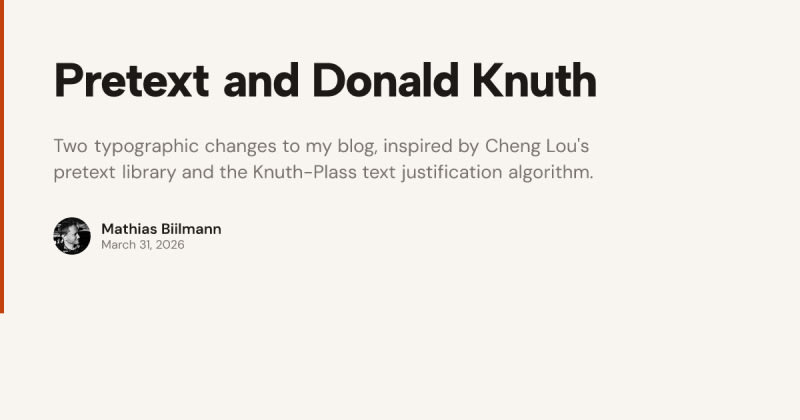 Mathias Biilmann describes two typographic improvements made to his blog using Cheng Lou's new pretext JavaScript library. The first applies the Knuth-Plass text justification algorithm — a global paragraph optimization approach originally developed for TeX — to produce evenly spaced justified text, unlike the greedy