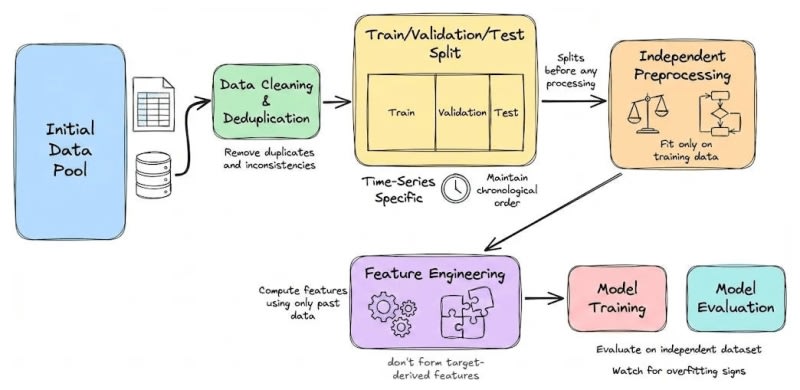 Data leakage occurs when ML models accidentally access information during training that won't be available during inference, causing artificially high training accuracy but poor real-world performance. Common causes include train/test contamination, preprocessing with combined dataset statistics, and using target-derived