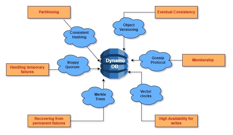 Partitioning and replication using consistent hashingEventual consistency using object versioningConsistency among replicas using sloppy quorumsQuorum based replica controlConflict detection and resolution using Merkle treesFailure and membership managed using Gossip protocolSort: