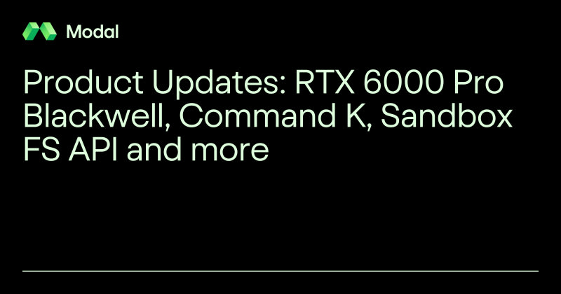⚡RTX 6000 Pro Blackwell is now available on Modal⌨️ Command K now in the dashboard📁 Sandbox Filesystem API now in Beta💻 SDK Updates📖 Content Roundup📍 Find Modal this AprilSort: