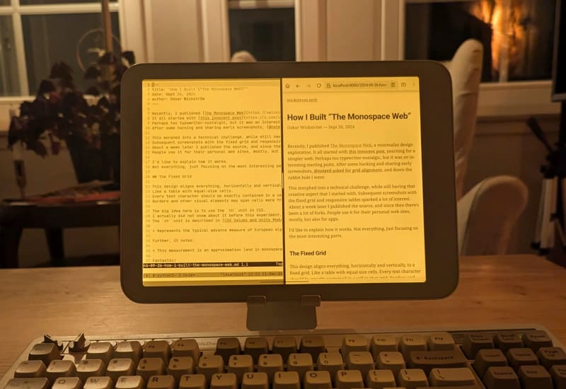 A developer shares their year-long experience using the Daylight DC-1 tablet with a Live Paper display for programming outdoors in sunlight. The setup uses Termux, Neovim, and tmux with a Bluetooth keyboard, offering a paperlike coding experience with better refresh rates than traditional E-Ink. The author compares it to the
