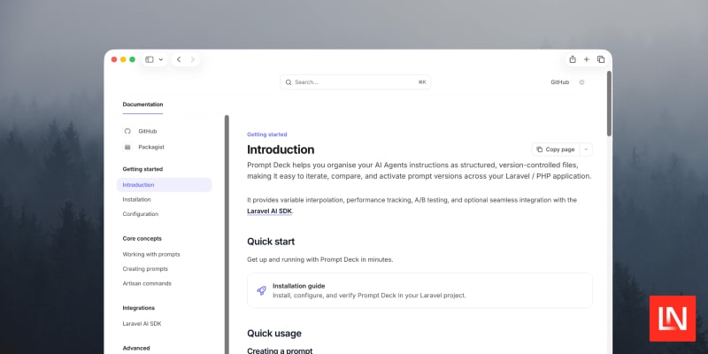 Prompt Deck is a Laravel package that manages AI prompts as versioned markdown files on disk instead of hardcoded strings. It supports variable interpolation with `{{ $variable }}` syntax, directory-based versioning, Artisan commands for creating and activating prompt versions, A/B testing across versions by token usage and