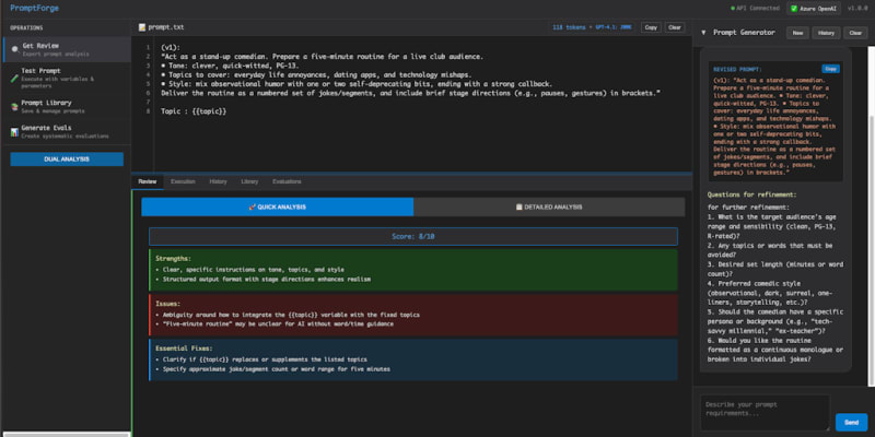 PromptForge is an AI prompt engineering workbench that provides tools for crafting, testing, and systematically evaluating prompts. It includes powerful analysis capabilities to help developers optimize their AI prompts through structured testing and evaluation processes.