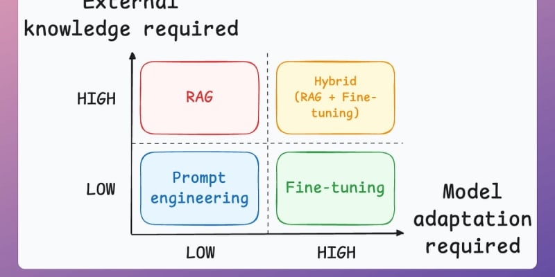 A decision framework for choosing between prompt engineering, RAG, and fine-tuning when building LLM applications. The choice depends on two key factors: the amount of external knowledge required and the level of model adaptation needed. RAG works best for custom knowledge bases without behavior changes, fine-tuning modifies