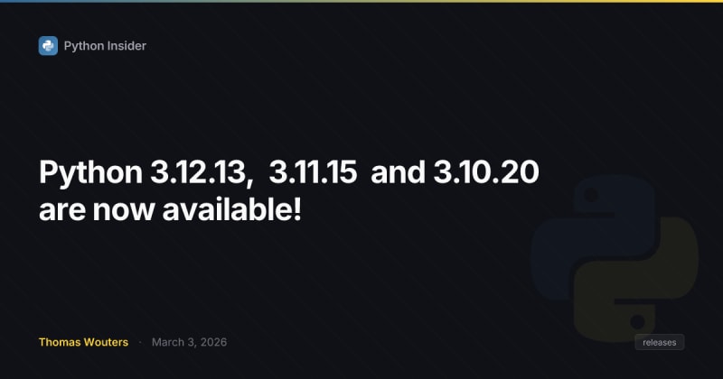 Security-only releases for Python 3.12.13, 3.11.15, and 3.10.20 are now available. These source-only releases address multiple CVEs and security issues across email header handling (CVE-2024-6923), XML parsing via libexpat upgrade to 2.7.4 (CVE-2026-24515, CVE-2026-25210, CVE-2025-59375), HTTP/cookie/URL control character