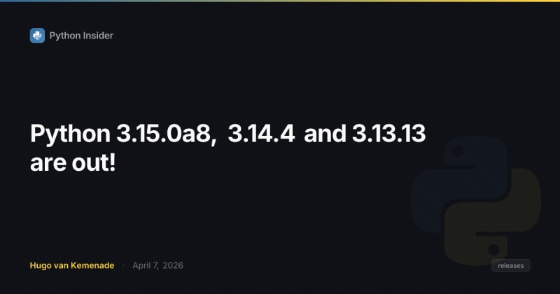 Python has released three new versions: 3.15.0a8 (the final planned alpha for 3.15), 3.14.4 (fourth maintenance release with ~337 fixes), and 3.13.13 (thirteenth maintenance release with ~200 fixes). Python 3.15 highlights include PEP 810 explicit lazy imports, a new frozendict built-in type, a statistical sampling profiler