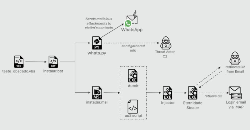 Eternidade Stealer, a Delphi-based banking trojan, targets Brazilian users through WhatsApp hijacking and social engineering. The malware uses a Python script (replacing previous PowerShell versions) to automate message spreading via WPPConnect, while employing IMAP to dynamically retrieve C2 addresses from compromised email
