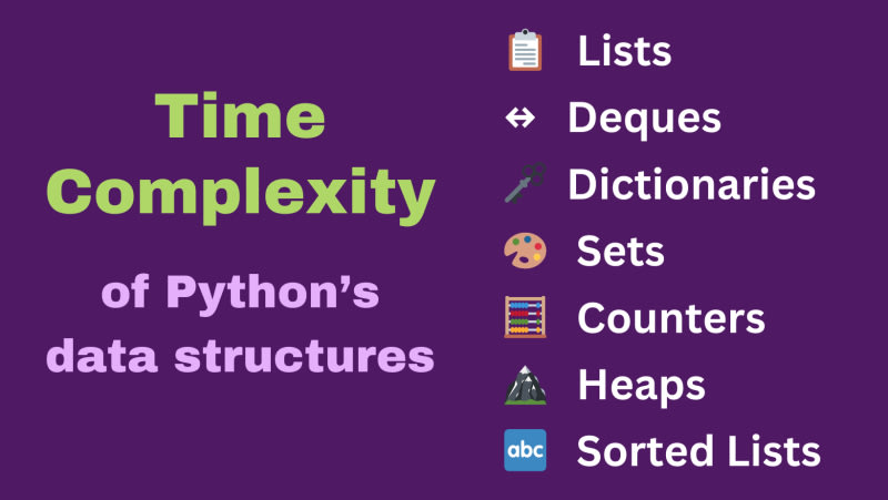 This post discusses the time complexities of different Python data structures and algorithms. It provides a cheat sheet for time complexity and explains how it affects code performance. The post covers the time complexities of list operations, deque operations, dictionary operations, set operations, Counter operations, heapq
