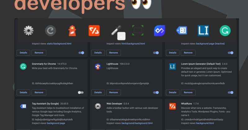 1. Daily.dev2. WhatRuns3. Coil4. Grammarly for Chrome5. Web Developer6. Tag Assistant (by Google)7. Lorem Ipsum Generator8. ColorZilla9. Window Resizer10. Lighthouse