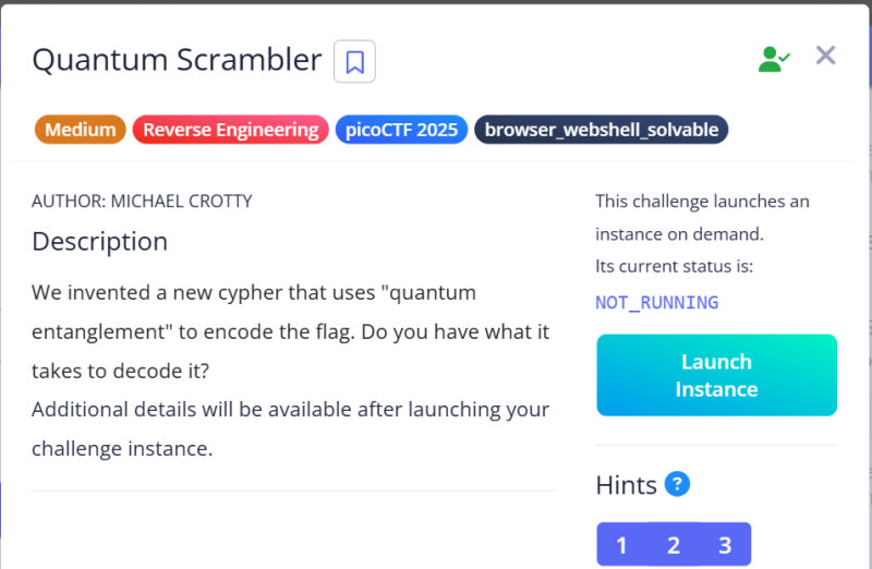 A walkthrough of solving the Quantum Scrambler reverse engineering challenge from picoCTF 2025. The challenge involves analyzing Python code that scrambles a flag by converting characters to hexadecimal and adding padding values. The solution extracts the first and last values from each scrambled list element and converts them back to characters to reveal the flag.