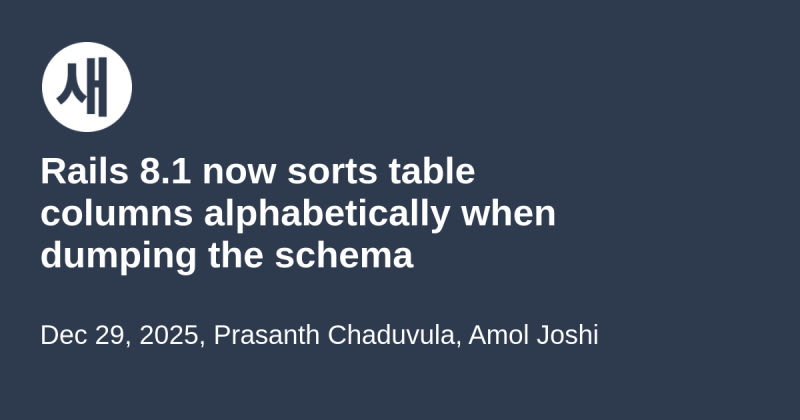 Rails 8.1 introduces alphabetical sorting of table columns in schema.rb dumps to prevent merge conflicts when multiple developers modify the same table. Previously, columns appeared in physical database order based on migration history, causing inconsistencies across different machines. The new alphabetical ordering is