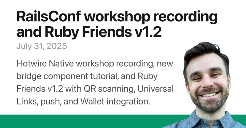 A newsletter update covering the release of a RailsConf Hotwire Native workshop recording on YouTube, a tutorial on adding native buttons to Hotwire Native apps using bridge components, and the launch of Ruby Friends v1.2 with new iOS features including QR code scanning, push notifications, Universal Links, and Apple Wallet