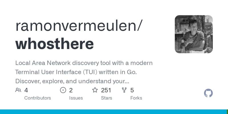 Whosthere is an open-source LAN discovery tool with a modern terminal interface written in Go. It uses unprivileged concurrent scans via mDNS, SSDP, and ARP cache reading to identify devices on local networks without requiring elevated privileges. Features include OUI manufacturer lookups, optional port scanning, daemon mode