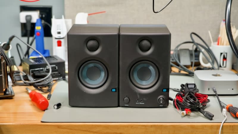PreSonus Eris E3.5 studio monitors developed crackling sounds after 5 years of daily use. Diagnosis revealed two bulging 1000µf 25V capacitors that needed replacement. The repair involved removing the back plate, dealing with brittle glued components, and replacing the failed capacitors with 1000µf 35V versions. The speakers