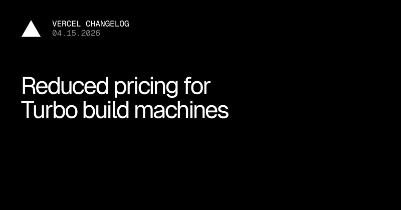 Vercel is reducing the price of Turbo build machines by 16%, moving to a unified pricing model of $0.0035 per CPU per minute. Turbo machines (30 CPUs) drop from $0.126 to $0.105 per minute. Standard (4 CPUs, $0.014/min) and Enhanced (8 CPUs, $0.028/min) machines remain unchanged. The change rolls out April 15 and will appear on invoices as 'Build CPU Minutes'.