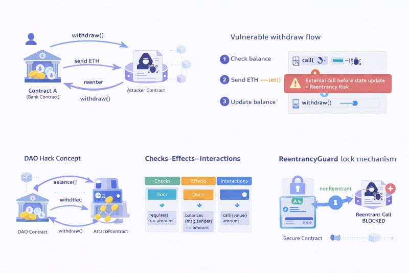 What Is Reentrancy?A Vulnerable Smart Contract ExampleExecution FlowWhy call() Can Cause ReentrancyThe DAO Hack: The Most Famous Reentrancy AttackThe Vulnerable DAO FunctionStep By Step AttackStep 1 Deposit into the DAOStep 2 Request WithdrawalStep 3 Fallback Function ExecutesStep 4 Recursive WithdrawalsResultGet Abraham ’s stories in your inboxHow ReentrancyGuard Prevents ThisHow It WorksUsing ReentrancyGuardThe Checks Effects Interactions PatternOther Reentrancy VariantsCross Function ReentrancyCross Contract ReentrancyRead Only ReentrancyReentrancy Prevention ChecklistFinal ThoughtsSort: