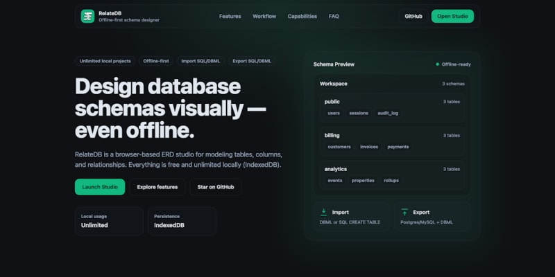 RelateDB is a browser-based database schema designer that works entirely offline without requiring accounts or cloud services. It allows developers to visually model tables and relationships, import and export SQL or DBML formats, auto-arrange diagrams, and export schemas as images. All functionality runs locally in the browser for fast, frictionless schema design.
