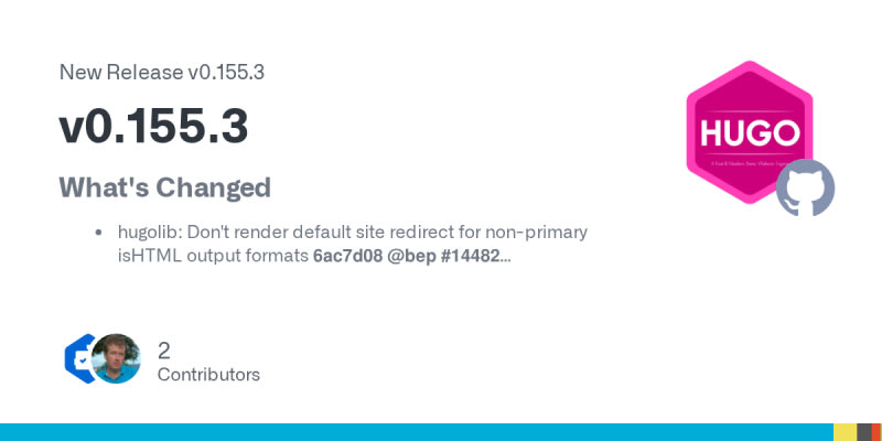 Hugo v0.155.3 fixes several bugs including an issue with default site redirects for non-primary HTML output formats, a stuck server global error logging problem, and a panic in the server browser error handler. The release also updates the esbuild dependency from 0.27.2 to 0.27.3.