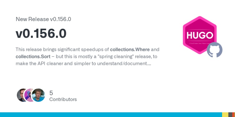 Hugo v0.156.0 is primarily a spring cleaning release focused on API simplification. It delivers performance improvements to collections.Where and collections.Sort, removes template functions and site methods deprecated since v0.136.0 (including data.GetCSV, data.GetJSON, crypto.FNV32a, resources.Babel, resources.PostCSS,