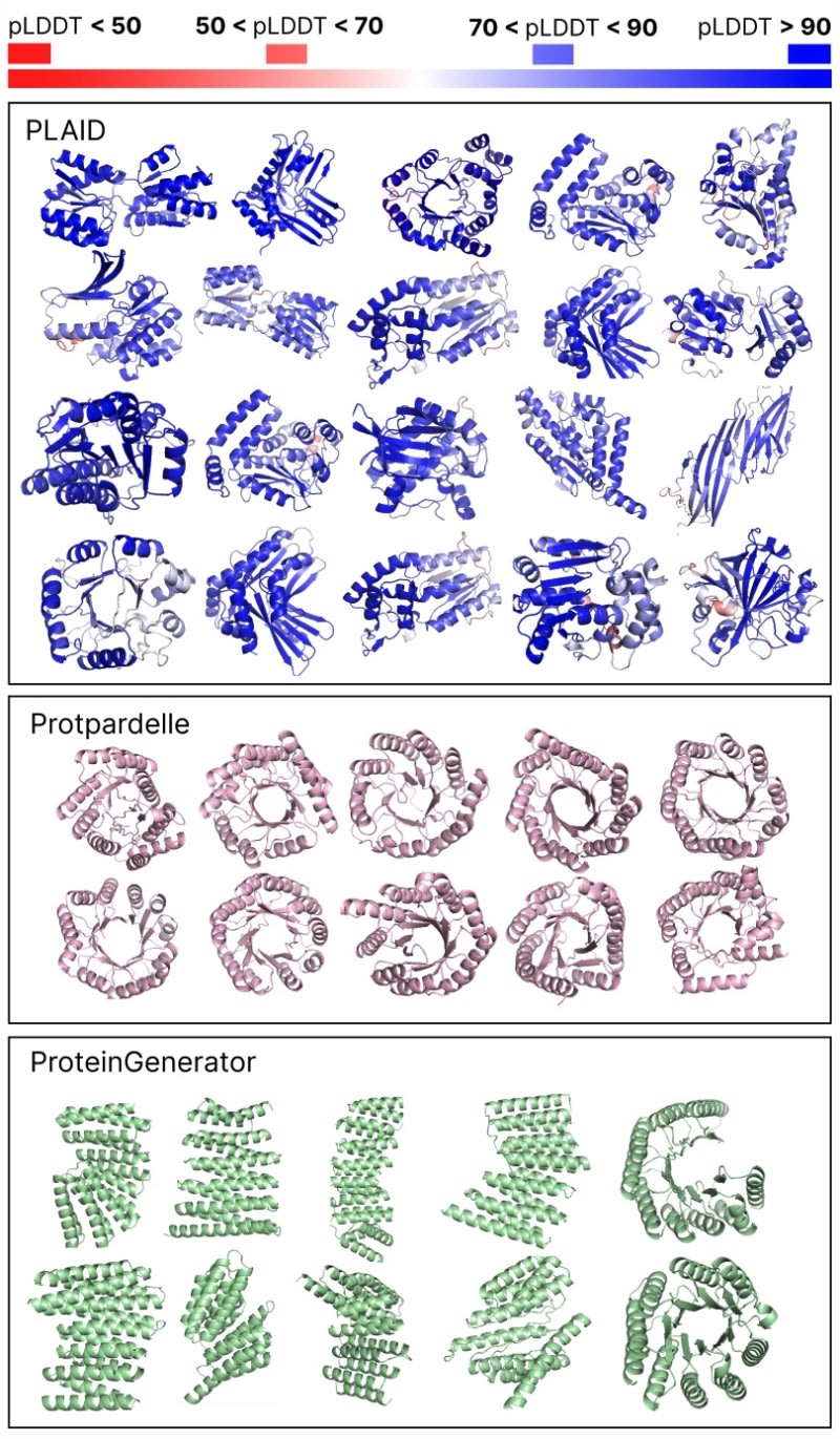 PLAID is a multimodal generative model that simultaneously produces protein sequences and structures by learning the latent space of protein folding models. It addresses limitations in previous models by generating all-atom structures and incorporating organism-specific constraints, useful for real-world applications like drug