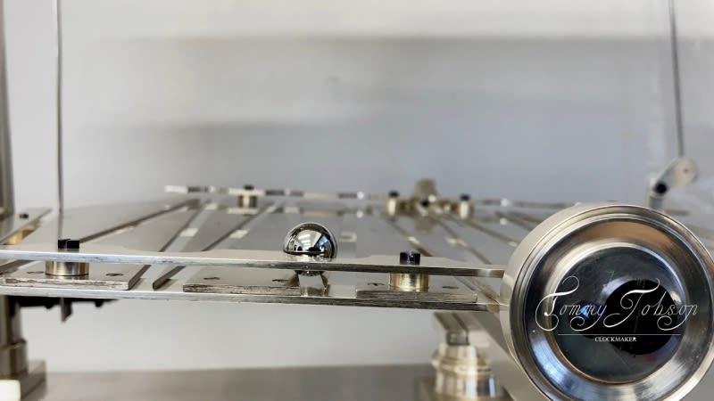 A detailed restoration of an antique mechanical clock that uses a rolling ball bearing as its time-keeping oscillator instead of a traditional pendulum or balance wheel. The restoration involved complete disassembly, cleaning, repairing bent pins with stronger replacements, applying protective lacquer, and extensive calibration