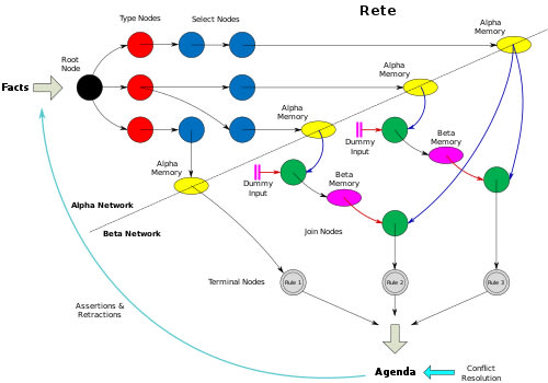 The Rete algorithm is a pattern matching algorithm used in rule-based systems to efficiently apply many rules or patterns to many facts in a knowledge base. It builds a network of nodes to determine which rules should fire based on the data store. Alternative variations include Rete II and Rete-NT, which claim to offer better