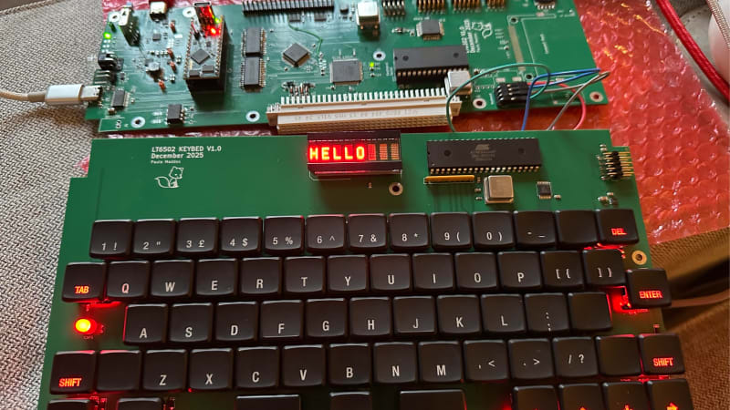 A DIY laptop project built around the vintage 6502 8-bit microprocessor from the 1970s. The LT6502 features a 9-inch foldable screen, 10,000 mAh battery, custom keyboard with low-profile switches, 46 KB RAM, CompactFlash storage, and runs EhBASIC. The build includes a 3D-printed case, custom PCBs, built-in LEDs, and various