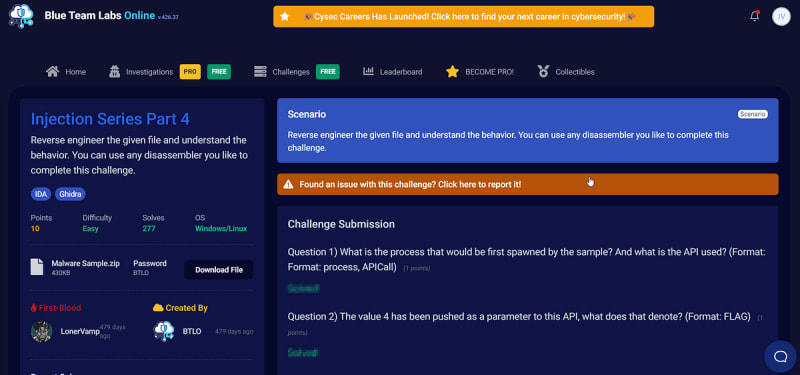 Reverse Engineering: Injection Series Part 4 is hosted on Blue Team Labs. You can use any disassembler you like to complete this challenge. The challenge asks to find out the first spawning process by a malware file and API used to spawn the process.