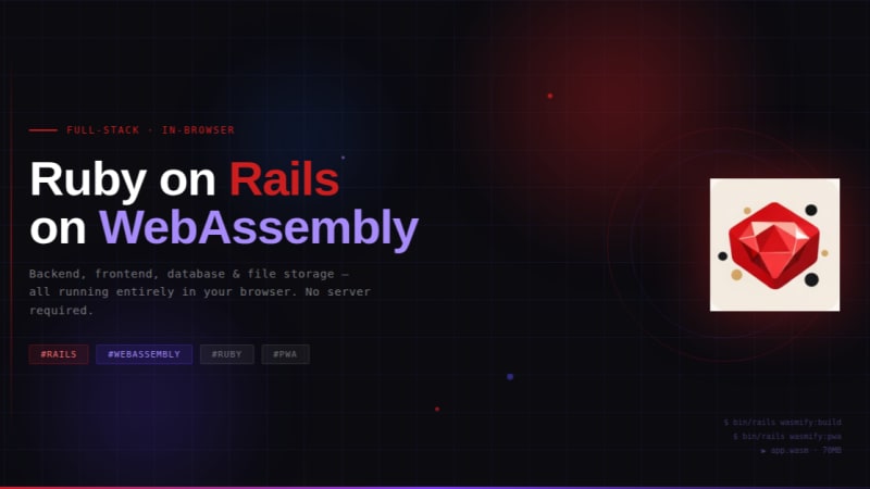 A technical walkthrough of running a full Ruby on Rails application entirely inside the browser using WebAssembly. The guide covers compiling Ruby 3.2+ to Wasm with the wasmify-rails gem, replacing Puma with a Service Worker, using SQLite compiled to Wasm for persistence, handling file storage via the Origin Private File System