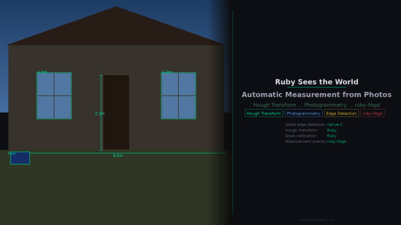 A walkthrough of building a single-image photogrammetry pipeline in Ruby using ruby-libgd. The approach uses a credit card as a known-size reference object in a photo, then applies edge detection (Sobel via native C), a Hough transform (pure Ruby) to find straight lines, credit card rectangle detection for scale calibration,