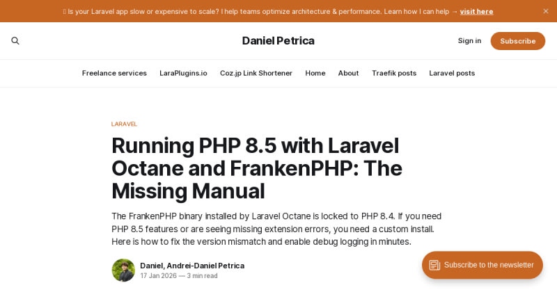 The default FrankenPHP binary installed via Laravel Octane's artisan command is statically compiled with PHP 8.4, preventing use of PHP 8.5 features or custom system extensions. This guide provides a solution for developers who need to run PHP 8.5 with Laravel Octane and FrankenPHP by working around this version lock.