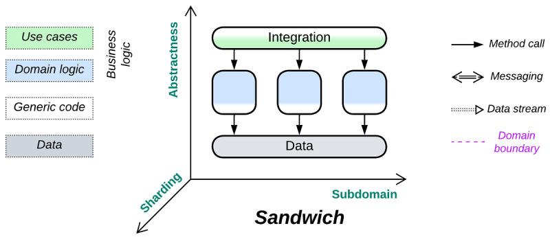 The 'Sandwich Architecture' is a system topology that sits between layered and service-based architectures. It consists of a shared integration layer on top, domain-level services in the middle, and a shared data layer at the bottom. This pattern emerges naturally when a layered system's domain layer is split into subdomains while the integration and data layers remain intact. It suits medium-sized projects with complex domain logic, offering a pragmatic balance of simplicity and flexibility. The article covers its structure, performance characteristics, dependency options (orchestration, data change notifications, choreography), applicability, and evolution paths. Real-world examples include Blackboard Systems, Space-Based Architecture, Service-Based Architecture, and CQRS.