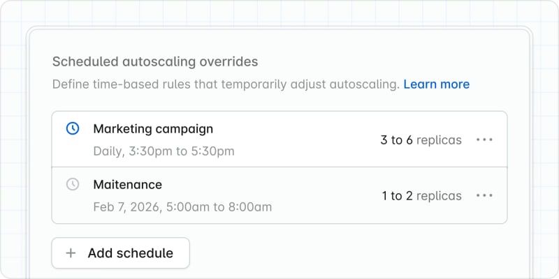Laravel Cloud now supports scheduled autoscaling, allowing developers to define time-based min/max scaling rules for app compute and queue clusters per environment. Instead of reactive scaling alone, teams with predictable traffic patterns (e.g., peak shopping hours, business-hours SaaS, batch jobs) can proactively set