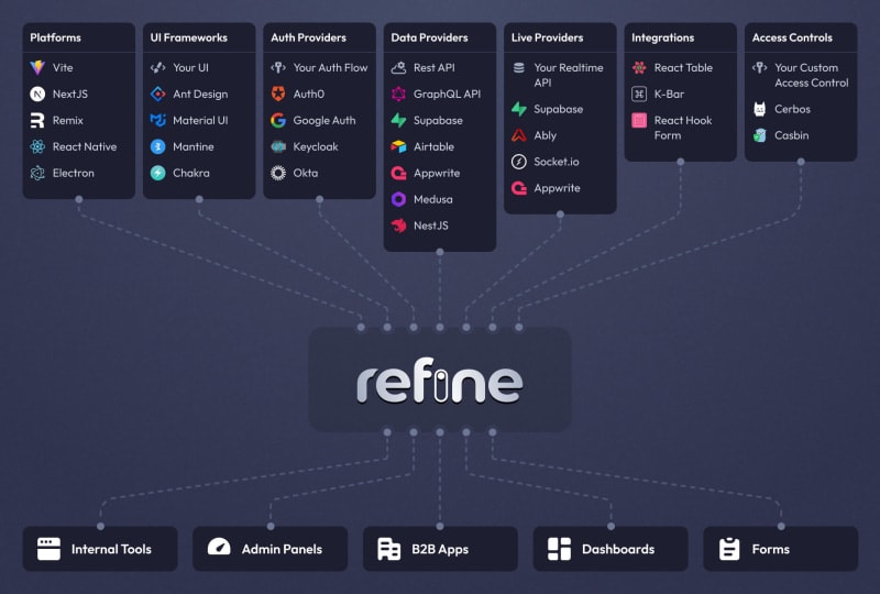 Refine is a React framework for developing CRUD applications. It provides industry standard components for crucial elements of an app and follows a headless approach for customization. It is currently used by companies like Atlassian, Intel, J.P. Morgan, Meta, Salesforce, and more.