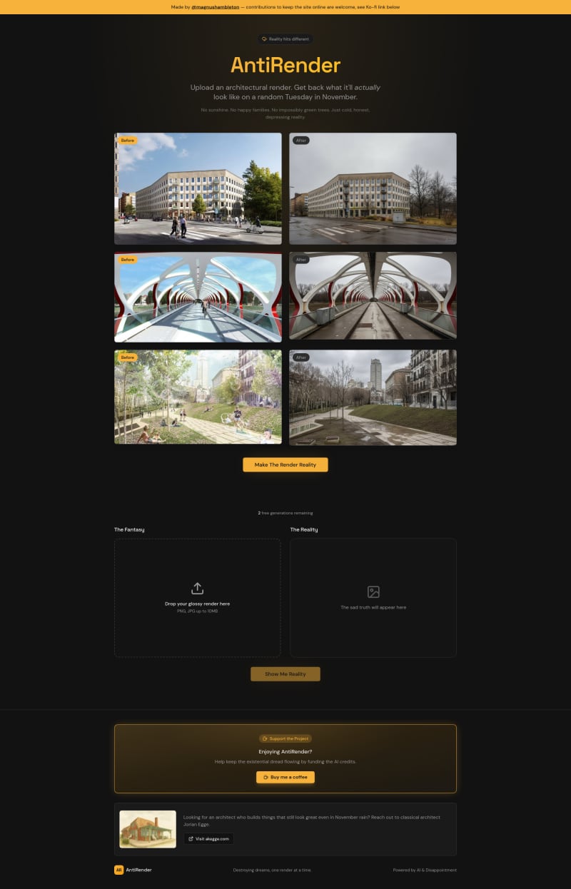AntiRender is a web tool that transforms idealized architectural renders into realistic depictions of how buildings actually look in everyday conditions. Upload a polished architectural visualization and receive a version showing the structure as it would appear on an ordinary day, without perfect lighting, greenery, or staged