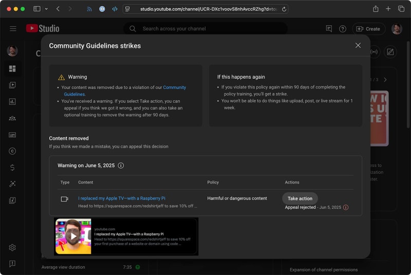 A content creator received two YouTube community guidelines violations for videos demonstrating self-hosted media solutions like LibreELEC and Jellyfin, despite showing only legal content management. YouTube flagged these tutorials as promoting unauthorized access to paid content, even though they focused on managing