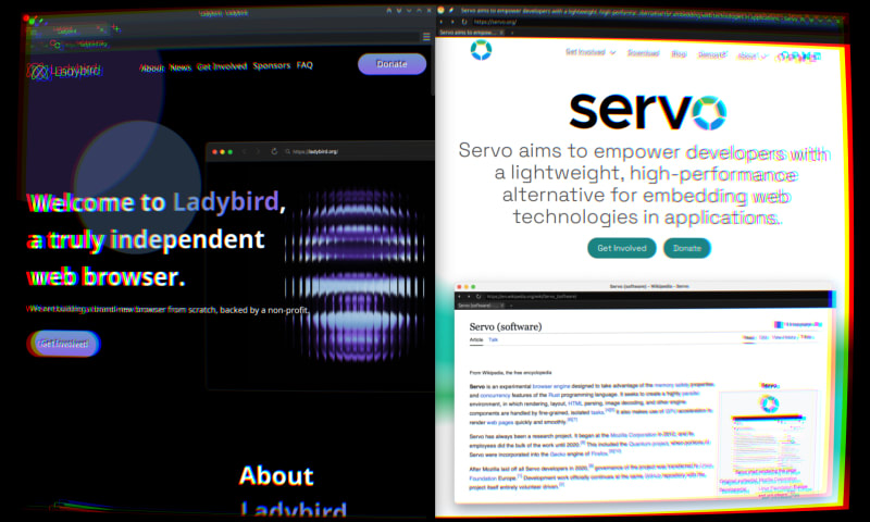 Servo, a Rust-based browser engine known for its performance and GPU acceleration, and Ladybird, an open-source browser with a focus on Qt GUI and web standards compliance, are compared. Despite setbacks, both projects have received funding and are in active development. Ladybird excels in web standards compliance with more