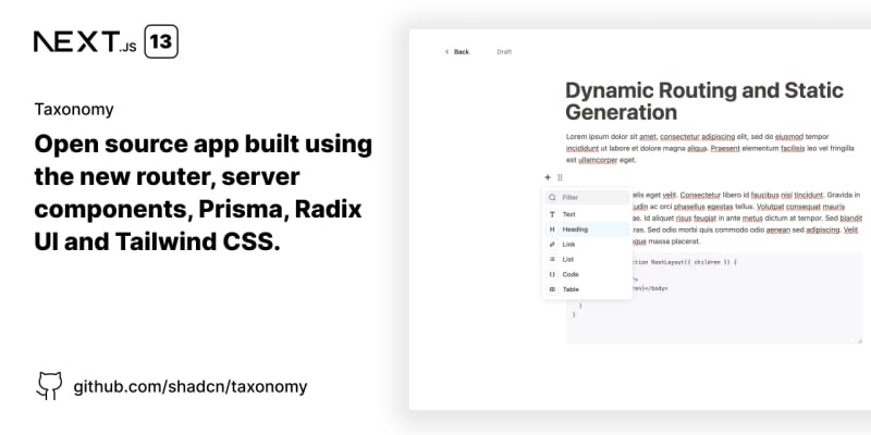 shadcn/taxonomy: An open source application built using the new router, server components and everything new in Next.js 13.js. You can follow the progress on Twitter @shadcn. The app is a work in progress.