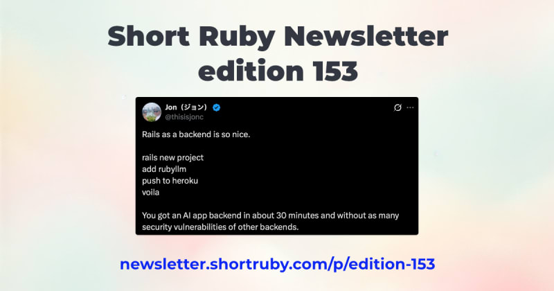 Edition 153 of the Short Ruby Newsletter covers major announcements: Rails 8.1.0 RC1 is out, Hanami 2.3 beta2 is released, and Ruby Core assumes stewardship of RubyGems and Bundler from Ruby Central. The issue also includes code samples on ActiveRecord organization, pattern matching in Ruby, Turbo Stream with Phlex, and