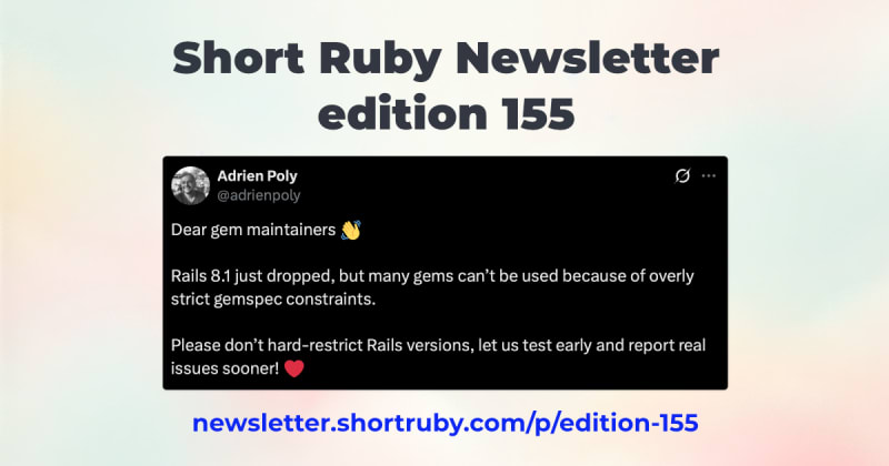 Edition 155 of the Short Ruby Newsletter covers the Rails 8.1.1 release and end-of-support announcement, Jean Boussier's deep dive into frozen string literals, upcoming Ruby community events (San Francisco Ruby Conference, Tropical on Rails 2026, Rails Camp USA), new gems and tools including RailsBilling, ractor-pool,