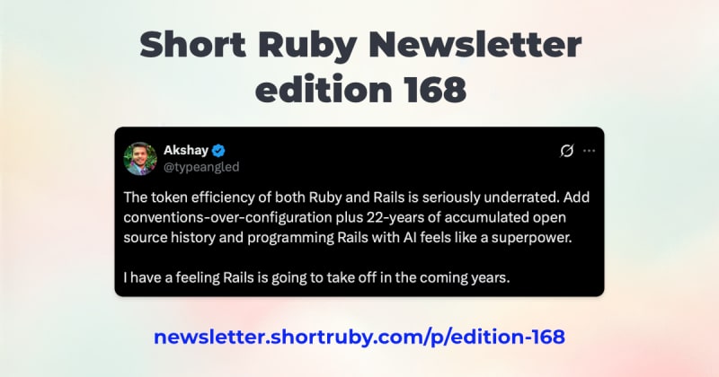 Table of Contents🚀 Launches and discounts📅 Events👉 All about Code and Ruby🧰 Gems, Libraries, Tools and Updates💼 Jobs🤝 Related (but not Ruby-specific)More content: 📚 🗞 🎧 🎥 ✍🏾Sort:
