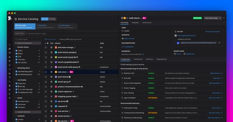 Datadog Service Catalog helps you consolidate knowledge of your organization’s services and streamline communication between SREs, application developers, and service owners. Service Catalog makes it easy for team members to reach out for ad-hoc communication before or during a deployment. It gives all parties a single source