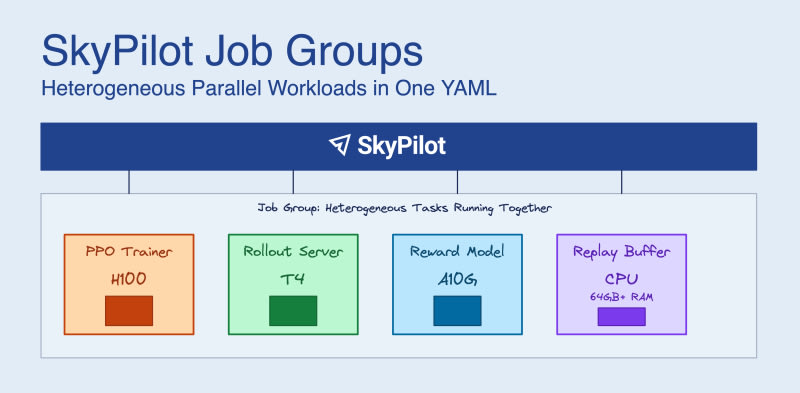 SkyPilot Job Groups is a new feature that lets you define heterogeneous ML workloads in a single YAML file. It solves the coordination problem in RL post-training (GRPO, PPO, RLHF) where different components need different hardware: H100s for the policy trainer, cheaper GPUs for inference rollouts, and high-memory CPUs for