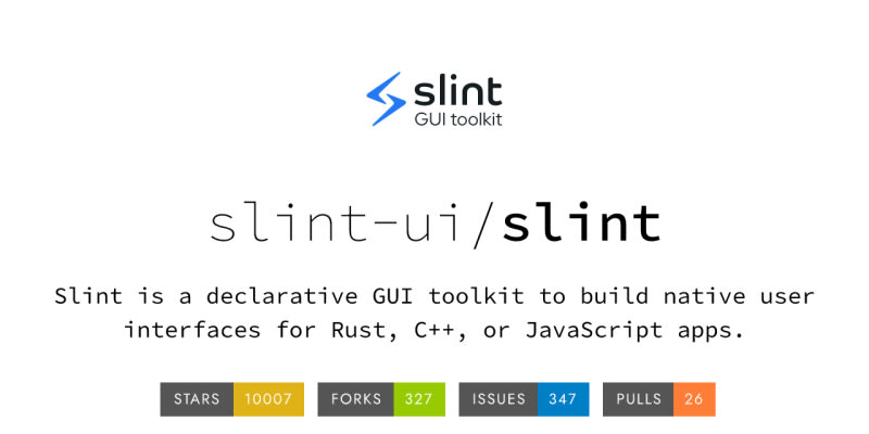 Slint is a declarative GUI toolkit for building native user interfaces in Rust, C++, or JavaScript. It aims to be scalable, lightweight, intuitive, and native. The current status of Slint is that it is actively being developed, with support for embedded devices and work in progress for desktop and web.